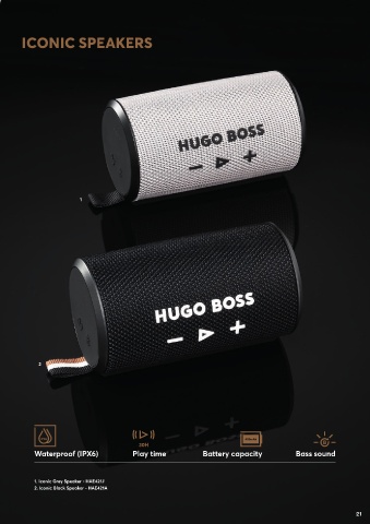 ICONIC SPEAKERS 1 2 Waterproof (IPX6) Play time Battery capacity Bass sound 1. Iconic Grey Speaker - HAE421J 2. Iconic Black Speaker - HAE421A 21